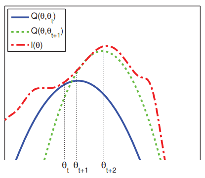 Source: Murphy (p.365, 2012). The dashed red curve represents the observed-data log likelihood (θ)\ell(\theta) while the blue and green lines represent, respectively, the lower bounds Q(θ,θt) Q(\theta, \theta^t) and Q(θ,θt+1) Q(\theta, \theta^{t+1}) tangential to (θ)\ell(\theta) at θt\theta^t and θt+1\theta^{t+1}. The E-step makes Q(θ,θt)Q(\theta, \theta^t) to touch (θ)\ell(\theta) at θt\theta^t by assigning qit(zi)=p(xi,zi;θt)q_i^t(z_i)=p(x_i,z_i; \theta^t). In the M-step we find θt+1\theta^{t+1} by maximizing Q(θ,θt)Q(\theta, \theta^t) . The difference between (θt+1) \ell(\theta^{t+1}) and Q(θt+1,θt)Q(\theta^{t+1}, \theta^t) correspond to the KL\mathbb{KL} divergence. In the next E-step we produce a new lower bound Q(θt,θt+1)Q(\theta^{t}, \theta^{t+1}) by setting qit+1(zi)=p(xi,zi;θt+1)q_i^{t+1}(z_i) = p(x_i, z_i; \theta^{t+1}). E-step and M-step are repeated until convergence.